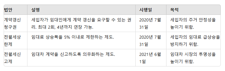 임대차 3법은 주택 임대차 시장의 안정을 도모하고, 세입자의 권리를 보호하기 위해 도입된 세 가지 주요 법안을 의미합니다. 아래는 각 법안의 주요 내용과 목적을 정리한 표입니다:
